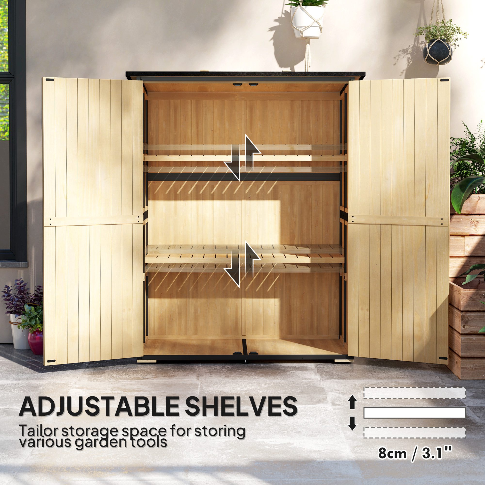 Wood Storage Shed, Outdoor Garden Shed with Asphalt Roof, 2 Shelves, Lockable Doors and Adjustable Feet, Natural
