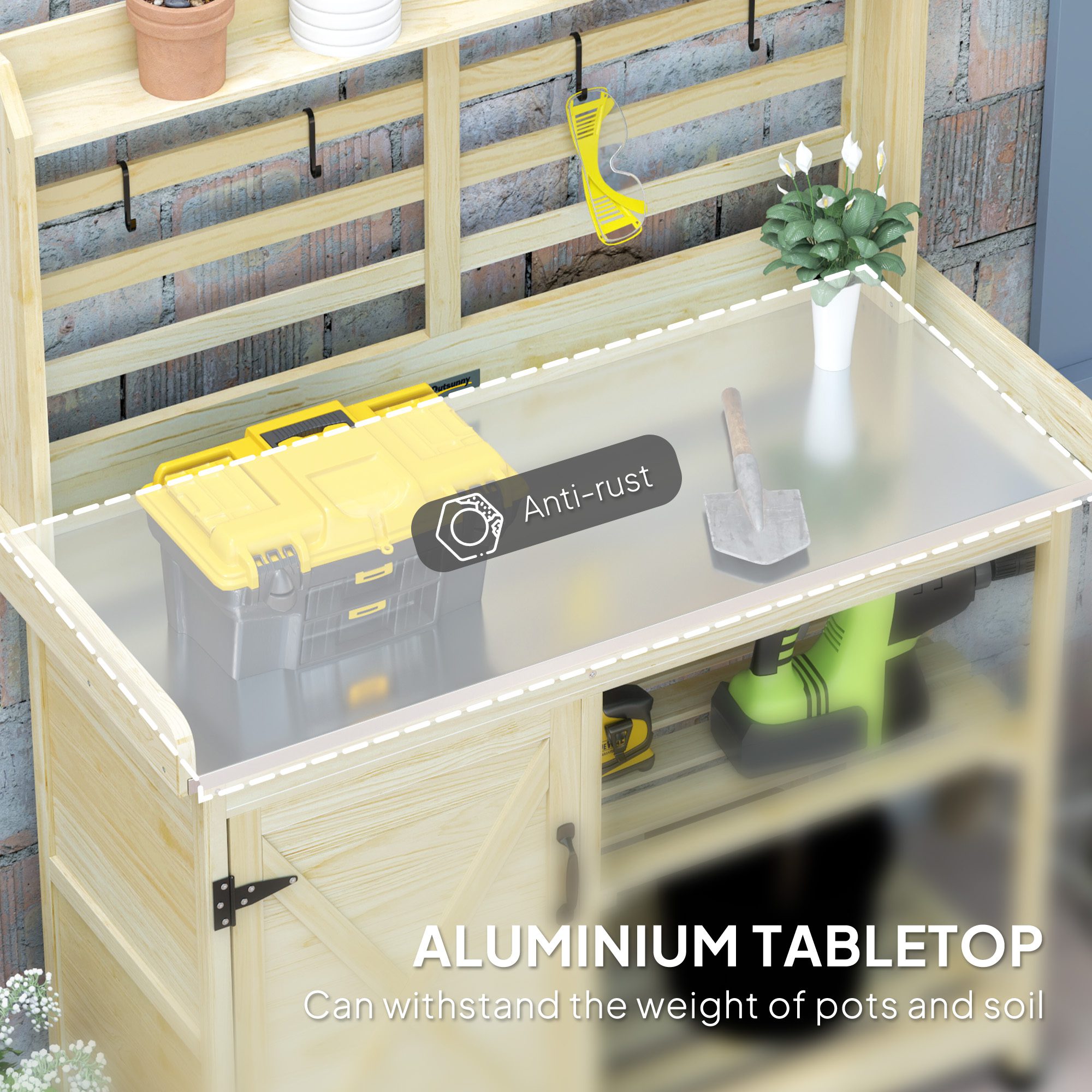 [BRAND NAME] potting station is a wonderful outdoor workstation for all your gardening needs. With a spacious work surface and large storage space, you will have plenty of space to carry out your gardening work. Equipped with a sink and a water tap, it is easy to carry out the gardening work and keep clean. With a country style, it will decorate your outdoor space and make you enjoyable when planting!