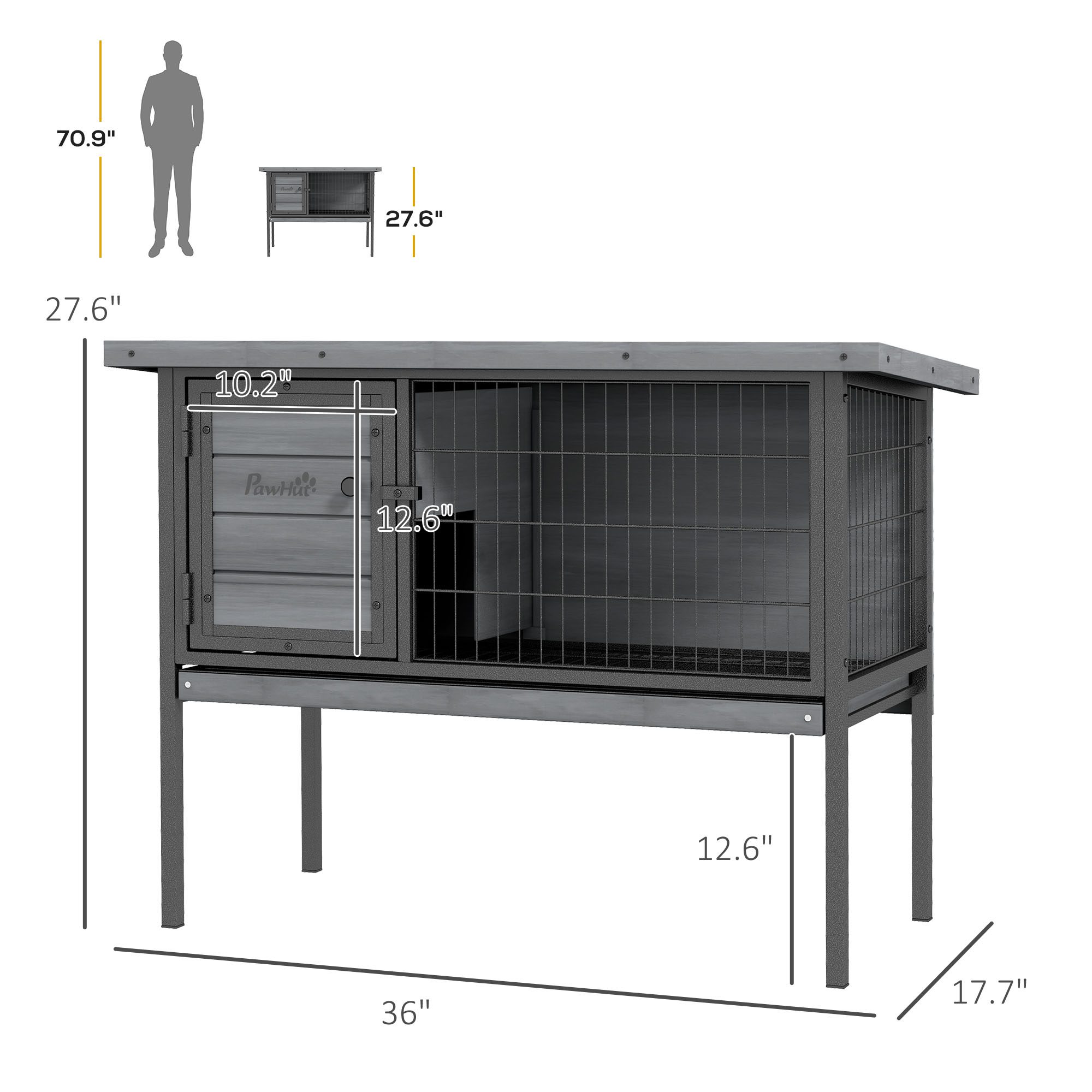 - – Solid fir wood frame with and tilted asphalt roof make this rabbit hutch suitable for outdoor use
